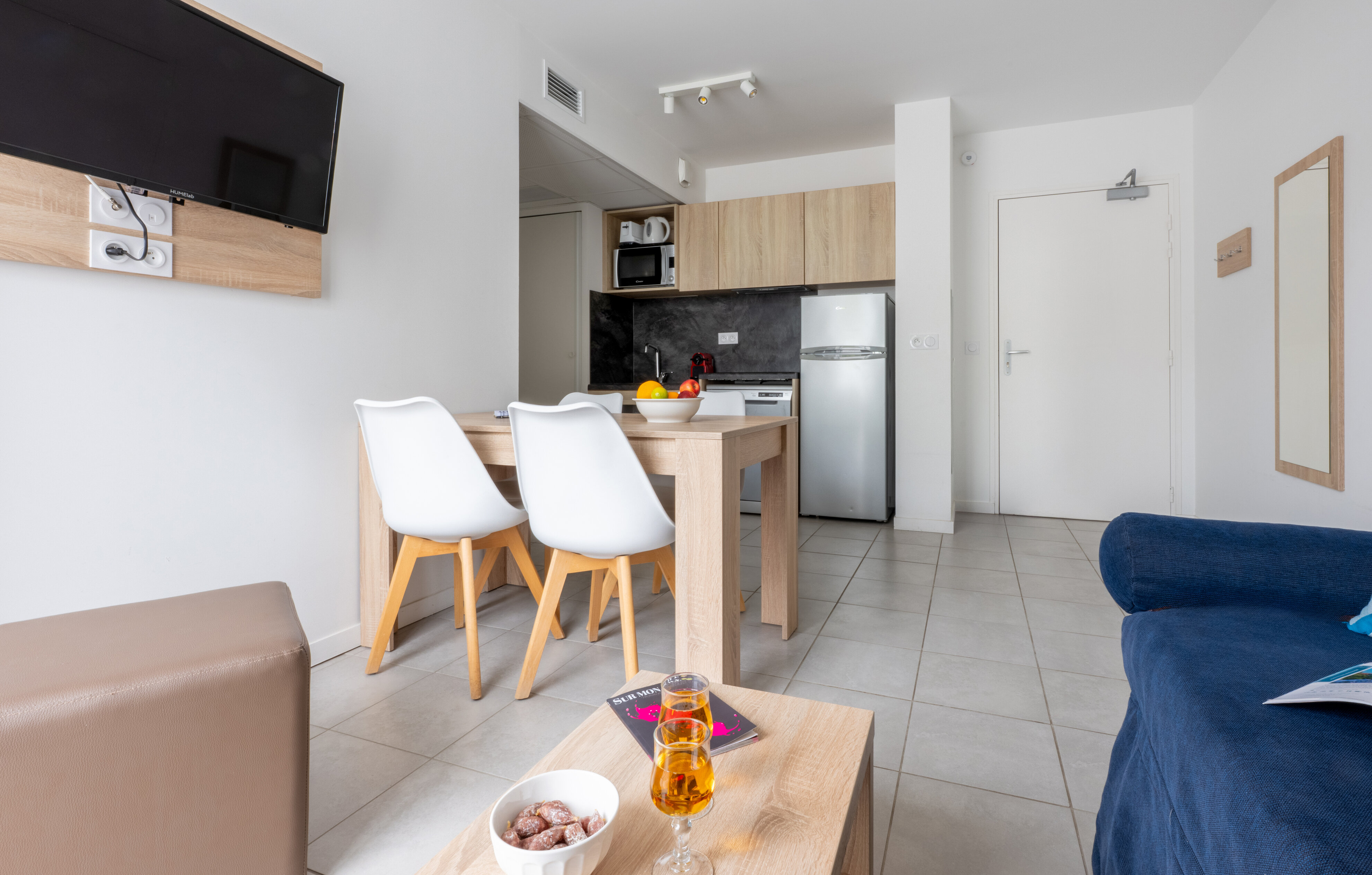 Die Kitchenette ist ausgestattet mit: Kühlschrank, Kochplatten, Mikrowelle, Geschirrspüler, Wasserkocher, Kaffeemaschine, Toaster