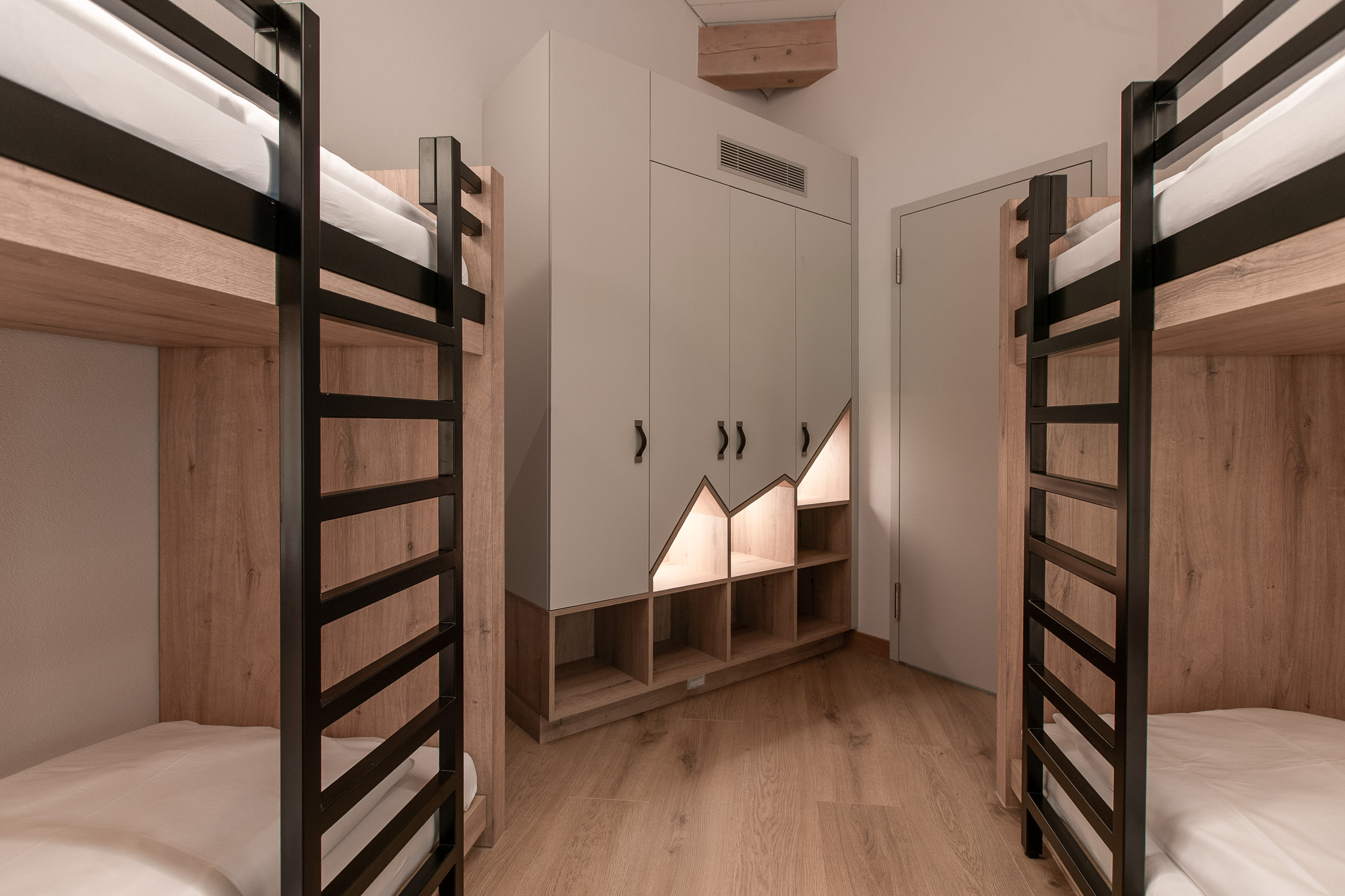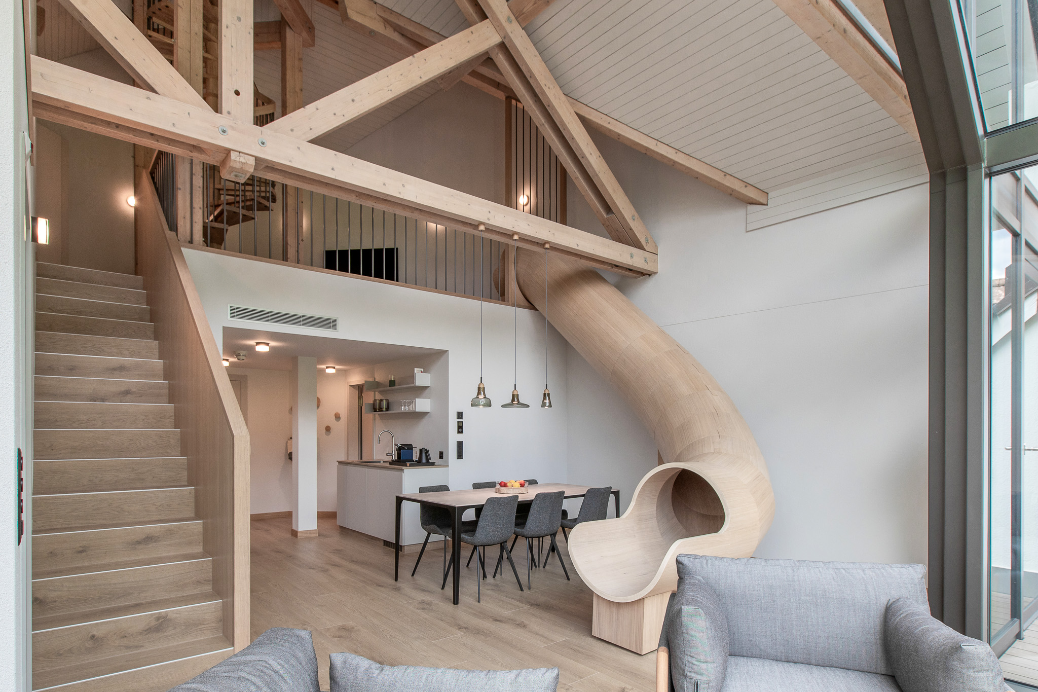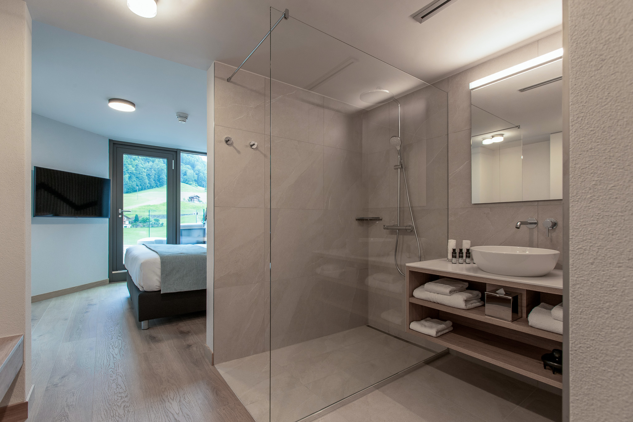 Die neu erbaute Panorama Suite mit Terrasse garantiert exklusive Familienferien mit traumhafter Aussicht und Spassfaktor. Die grosszügige, lichtdurchflutete Suite befindet sich auf der obersten Etage des Haupthauses und verfügt über ein Doppelzimmer, ein separates Kinderzimmer sowie ein geräumiges Badezimmer. Die grosse Terrasse eröffnet Ihnen eine atemberaubende Sicht auf das Bergpanorama – perfekt für ruhige Momente mit der ganzen Familie. Die Rutschbahn auf der Galerie ist das spielerische Highlight – ein echtes Abenteuer mit Erinnerungswert. Von Ihrem Zimmer aus erreichen Sie die Bäder- und Wellnessebene direkt und schnell, bequem im Bademantel, durch den unterirdischen Gang.