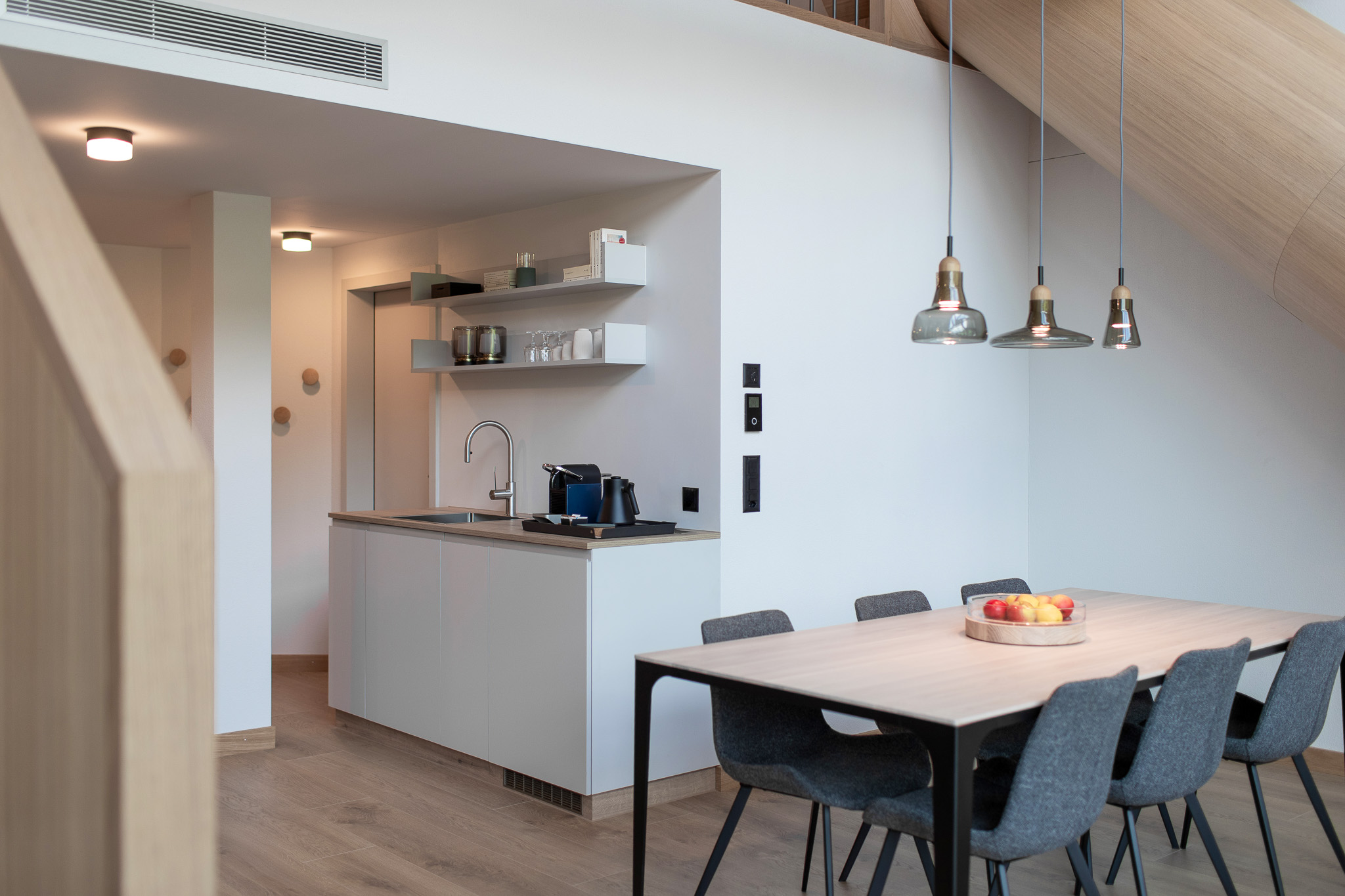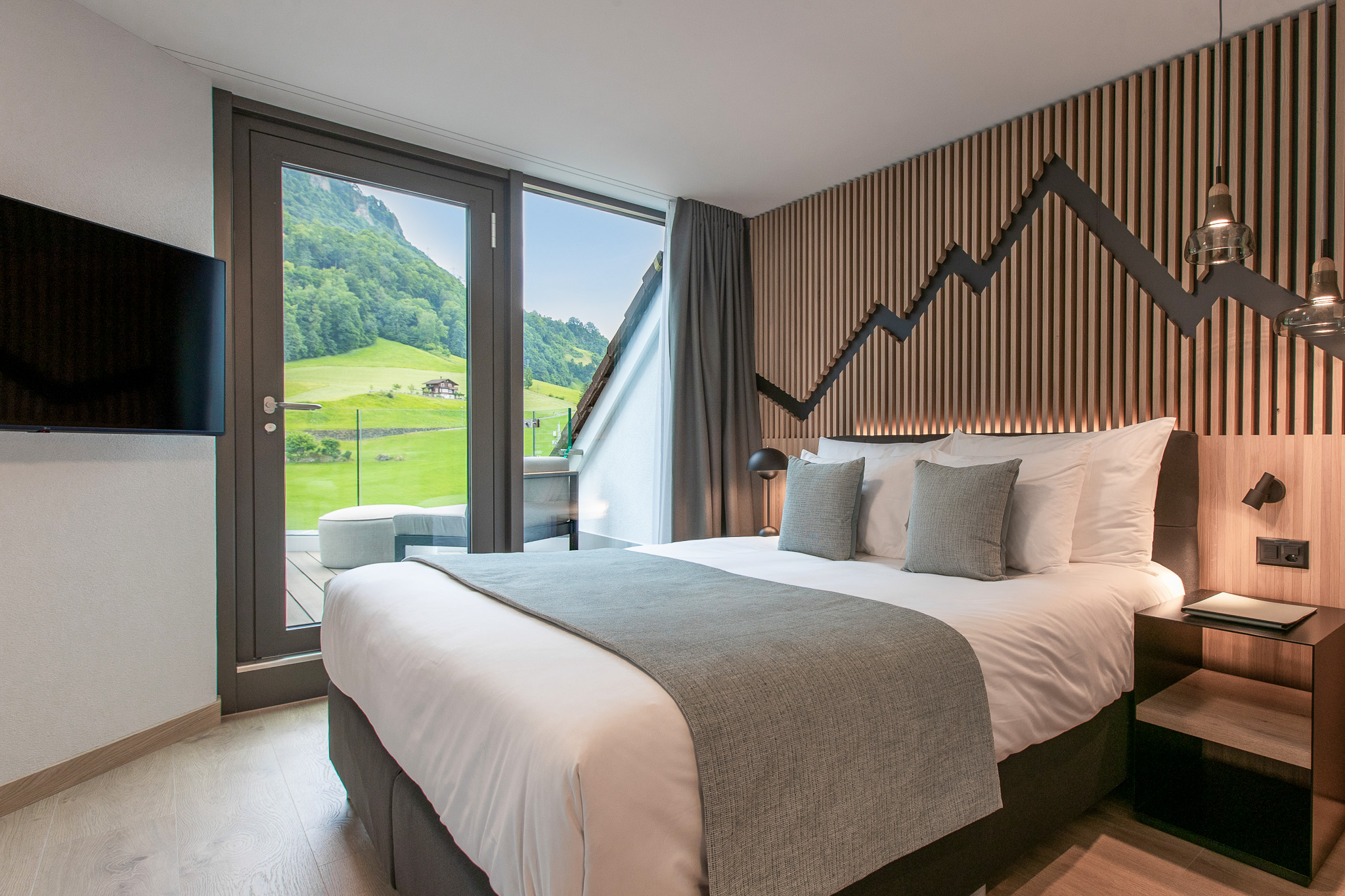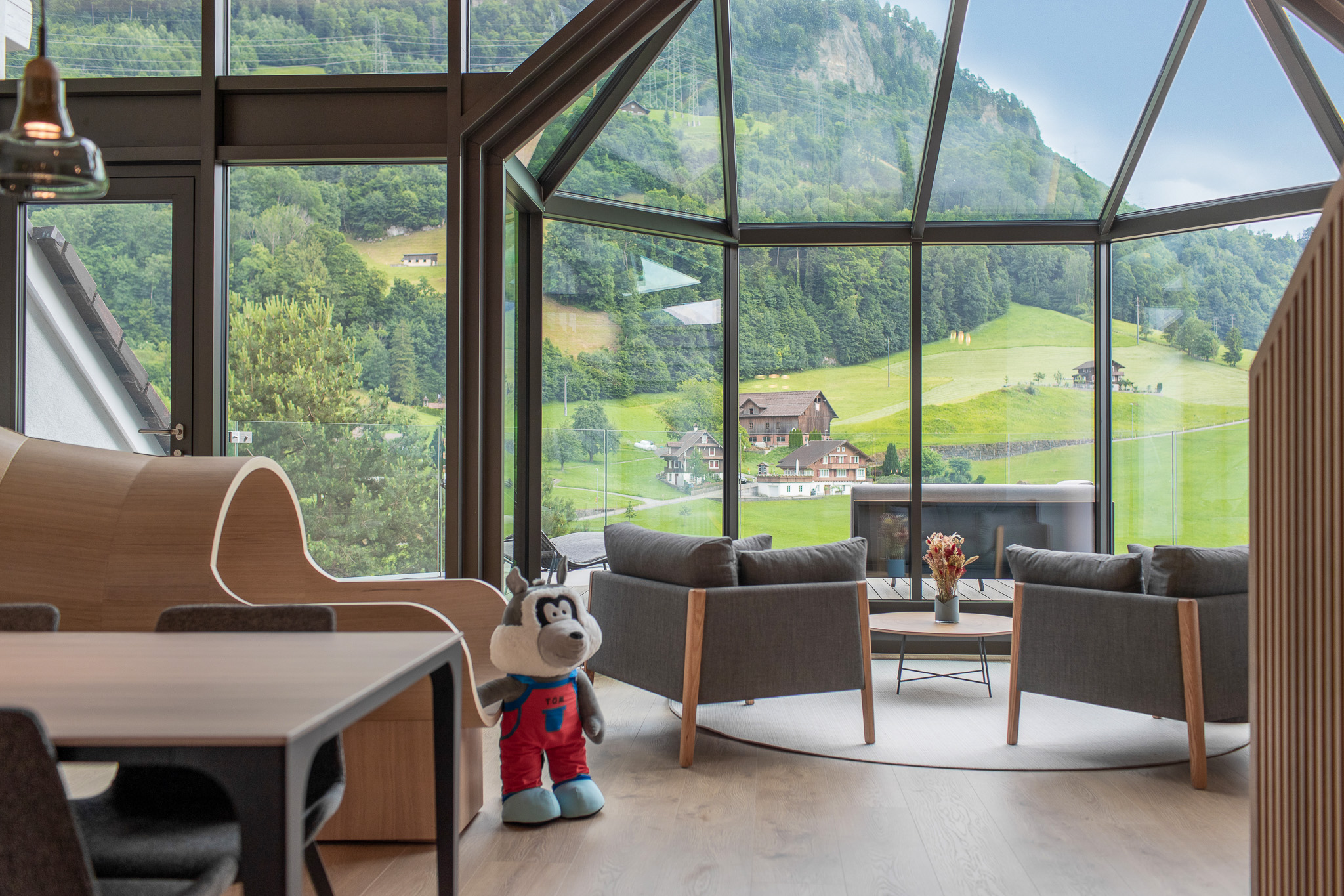 Die neu erbaute Panorama Suite mit Terrasse garantiert exklusive Familienferien mit traumhafter Aussicht und Spassfaktor. Die grosszügige, lichtdurchflutete Suite befindet sich auf der obersten Etage des Haupthauses und verfügt über ein Doppelzimmer, ein separates Kinderzimmer sowie ein geräumiges Badezimmer. Die grosse Terrasse eröffnet Ihnen eine atemberaubende Sicht auf das Bergpanorama – perfekt für ruhige Momente mit der ganzen Familie. Die Rutschbahn auf der Galerie ist das spielerische Highlight – ein echtes Abenteuer mit Erinnerungswert. Von Ihrem Zimmer aus erreichen Sie die Bäder- und Wellnessebene direkt und schnell, bequem im Bademantel, durch den unterirdischen Gang.