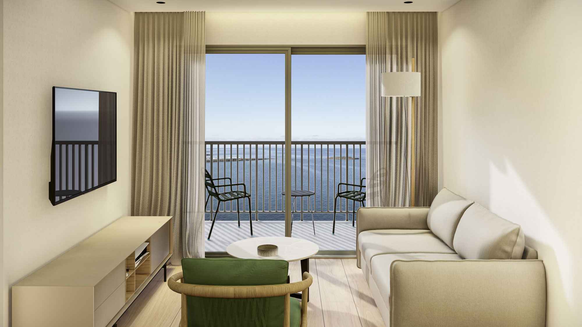 Die Suite mit Meersicht verfügt über: 1 abgetrennter Salon mit Sofabett, 1 Badezimmer mit Toilette, Telefon, kleiner Kühlschrank, Nespressomaschine, Gratis-Safe, Balkon.