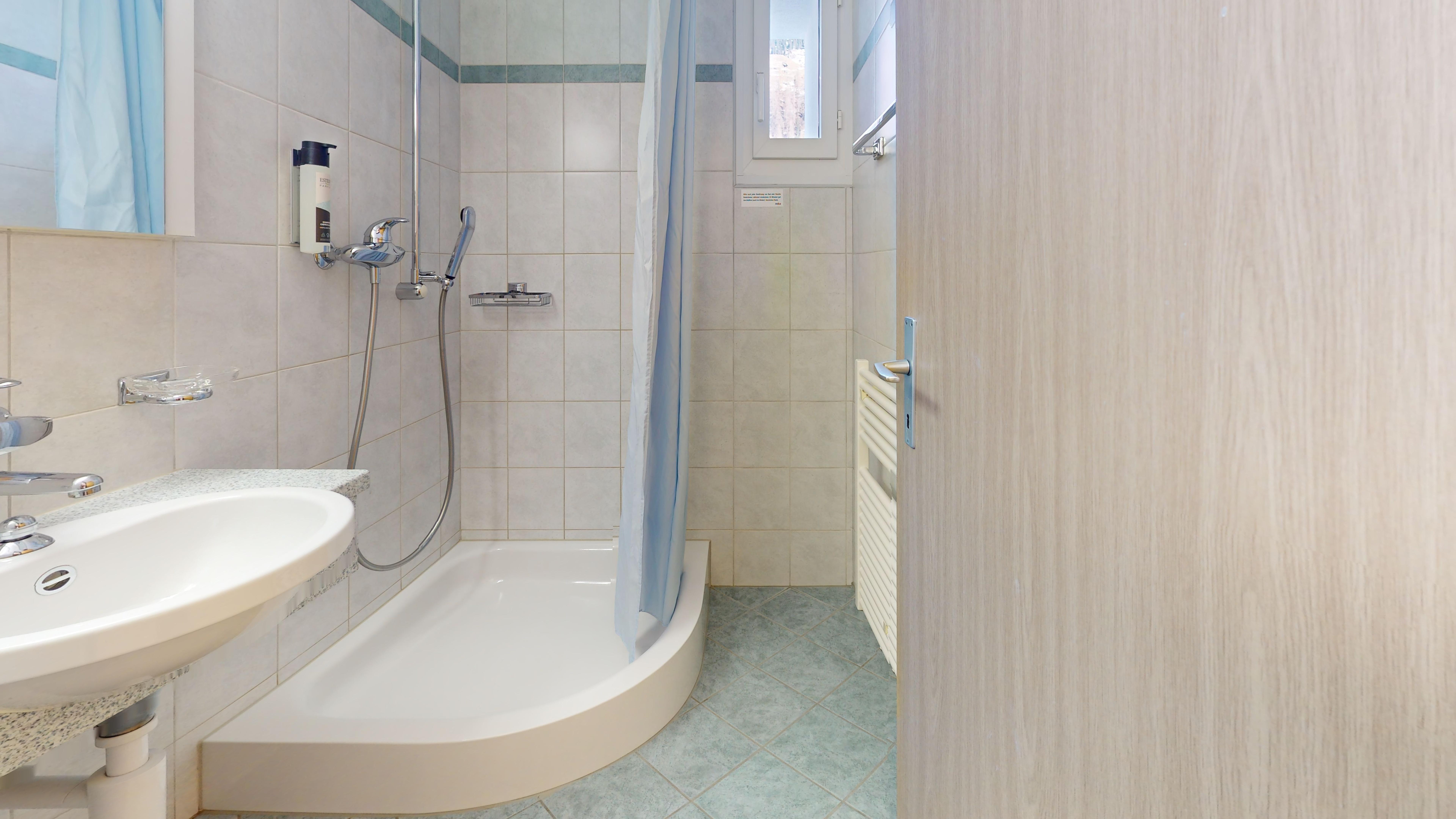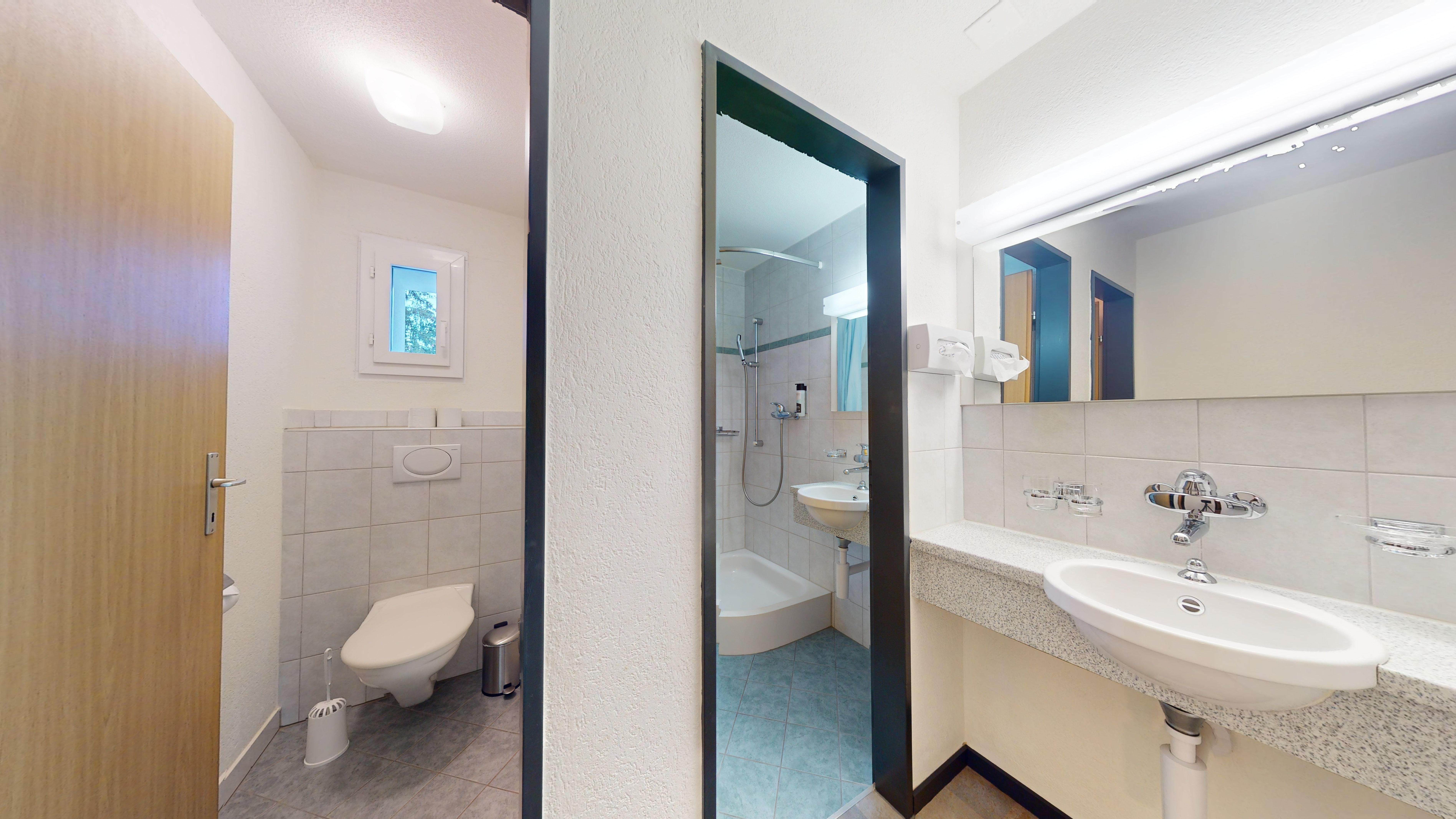 Zusätzliche Annehmlichkeiten wie Föhn, Handseife und Duschgel vervollständigen die Ausstattung